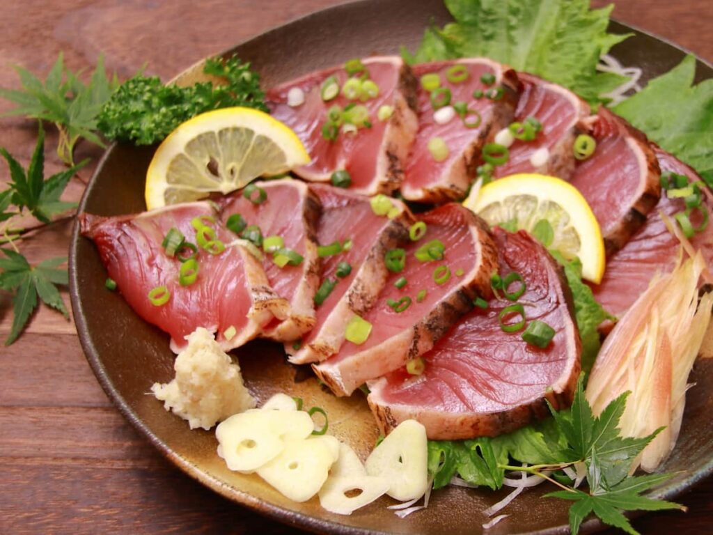 たたき、刺身、漬け丼、竜田揚げ、生姜焼きなど。表面を軽く炙るたたきは定番の食べ方です。