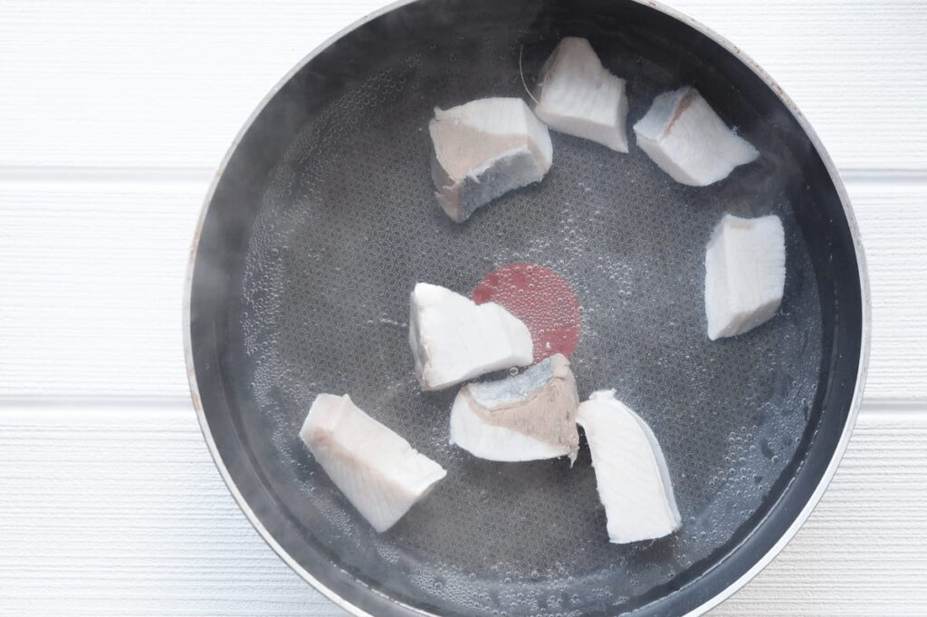 魚介類は霜降り(湯通し)臭みを取り、煮崩れを防ぐ