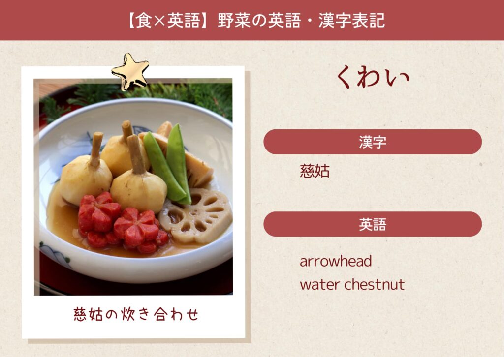 英語では「arrowhead(アローヘッド)」または「water chestnut(ウォーター・チェスナット)」と訳されることがありますが、厳密には異なる植物を指す場合もあります。