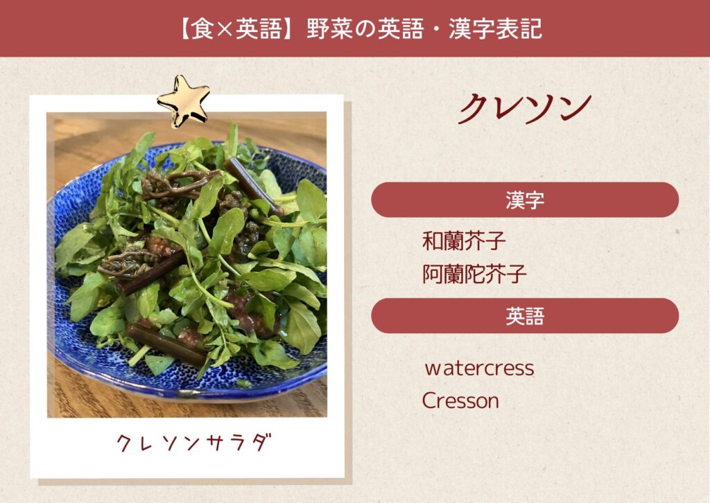クレソンは日本語では「オランダガラシ(和蘭芥子)」とも表記されますが、現在では「クレソン」というカタカナ名称が一般的です。