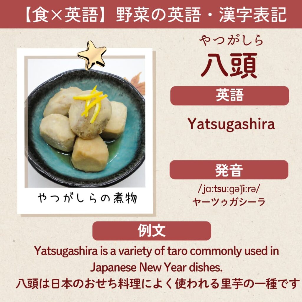 英語では「Yatsugashira」という固有名が知られていないことが多く、一般的には「Taro root」や「Japanese taro」と訳されることがあります。ただし、八頭は里芋(taro)の一種であり、特に親芋と子芋が密着して丸ごと食べられる品種であることから、調理用途や味の面で独自性があります。