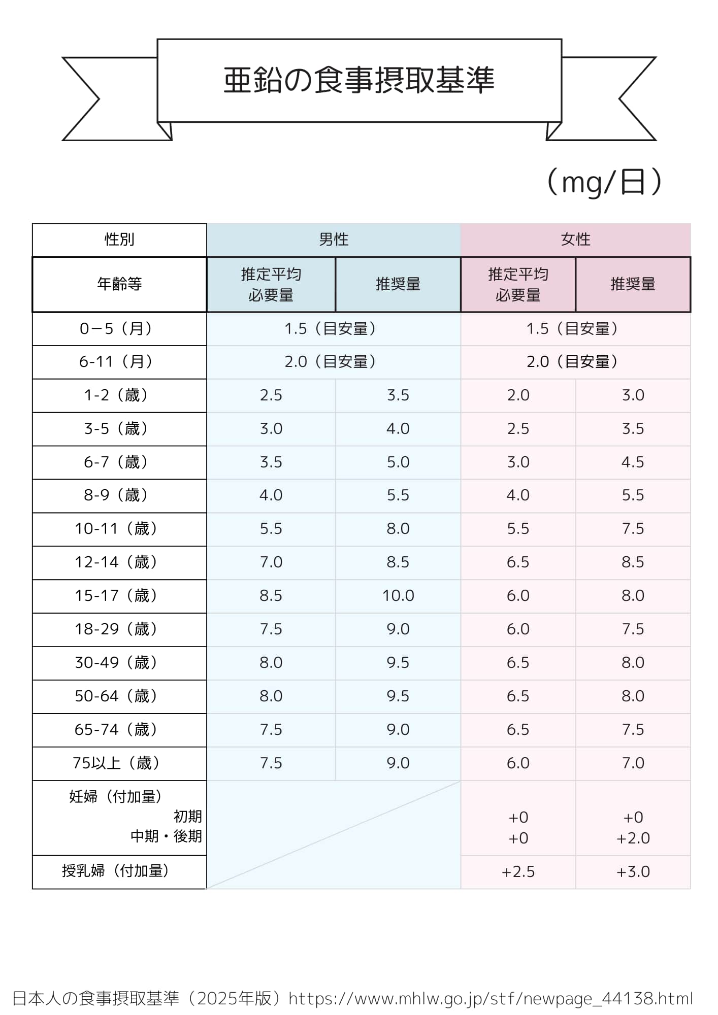 亜鉛の食事摂取基準|年齢・性別別の必要量を解説!